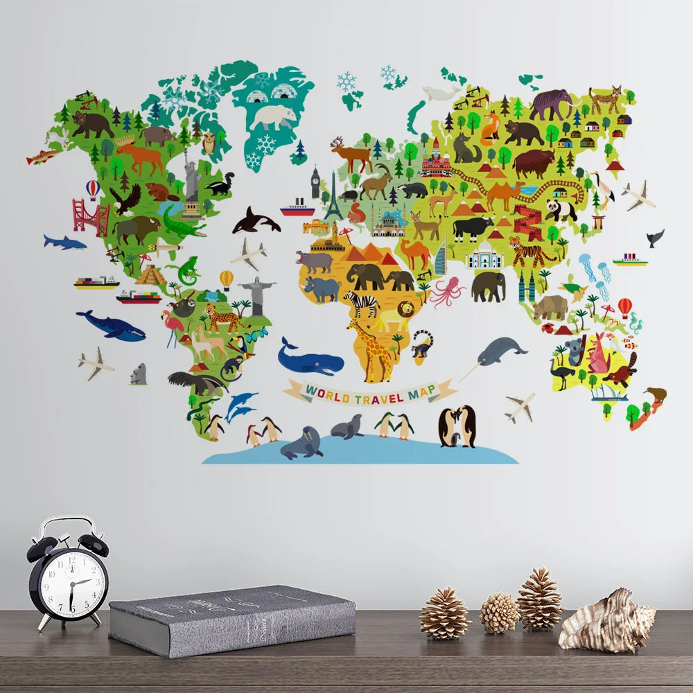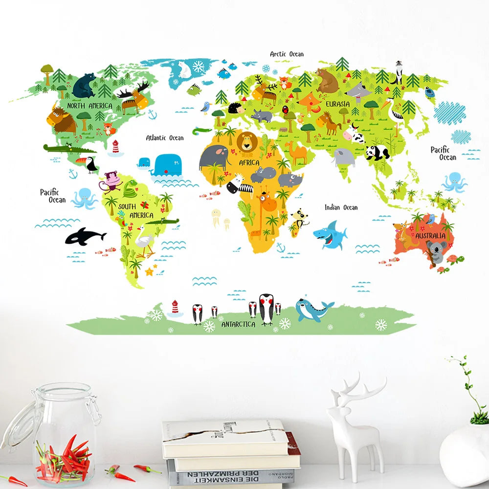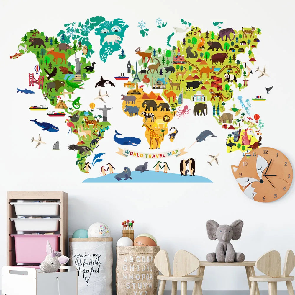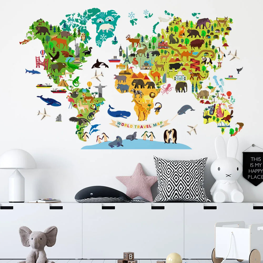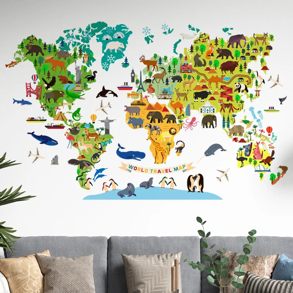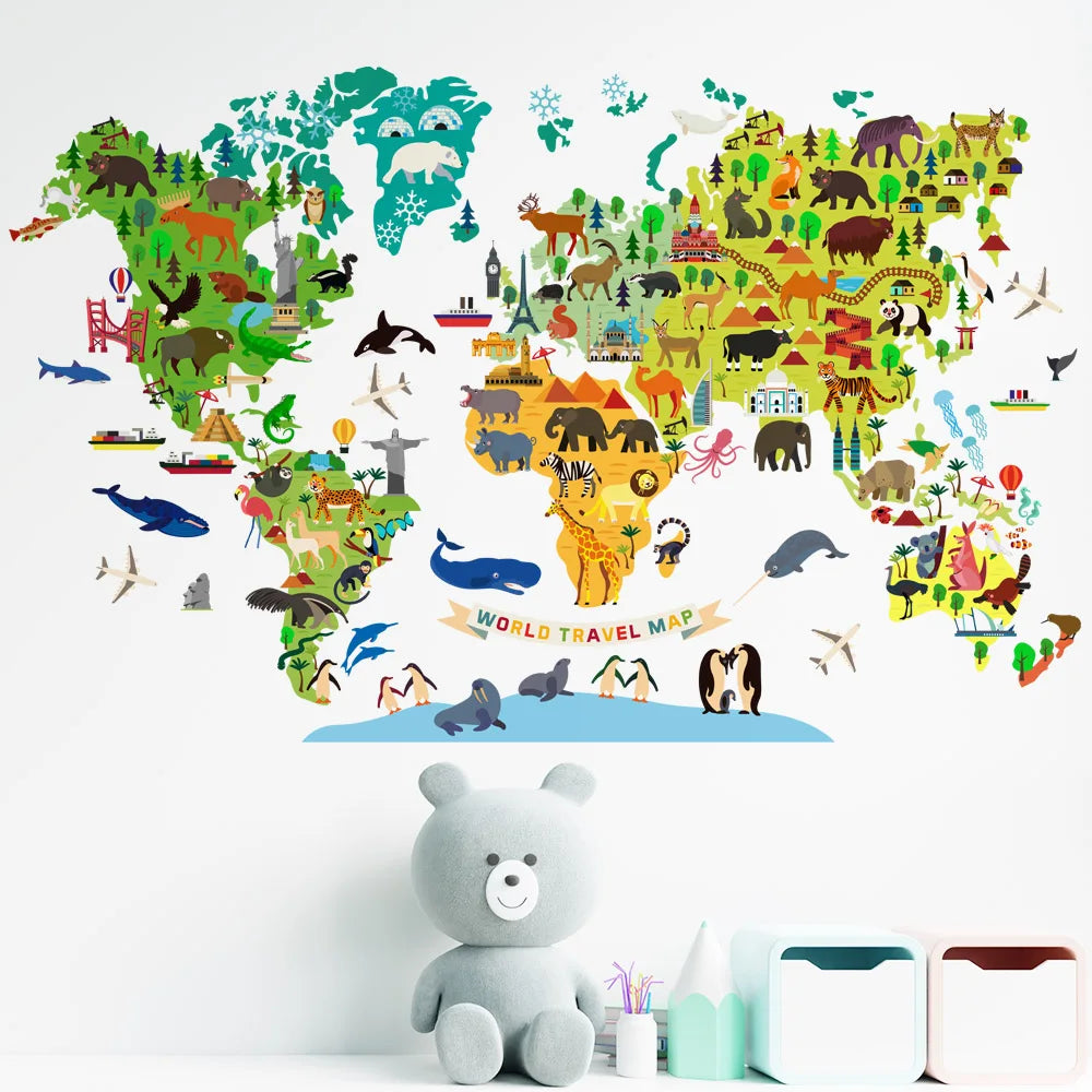 Un Éveil Ludique avec le Sticker Mural Carte du Monde Illustrée avec Animaux